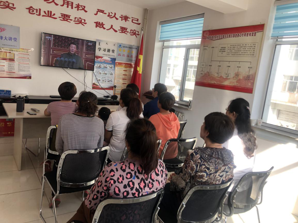 2019年10月1日,大庆社区组织两委成员、党员在会议室观看国庆阅兵盛况,共同感受祖国的强盛,祝愿伟大的祖国繁荣富强。